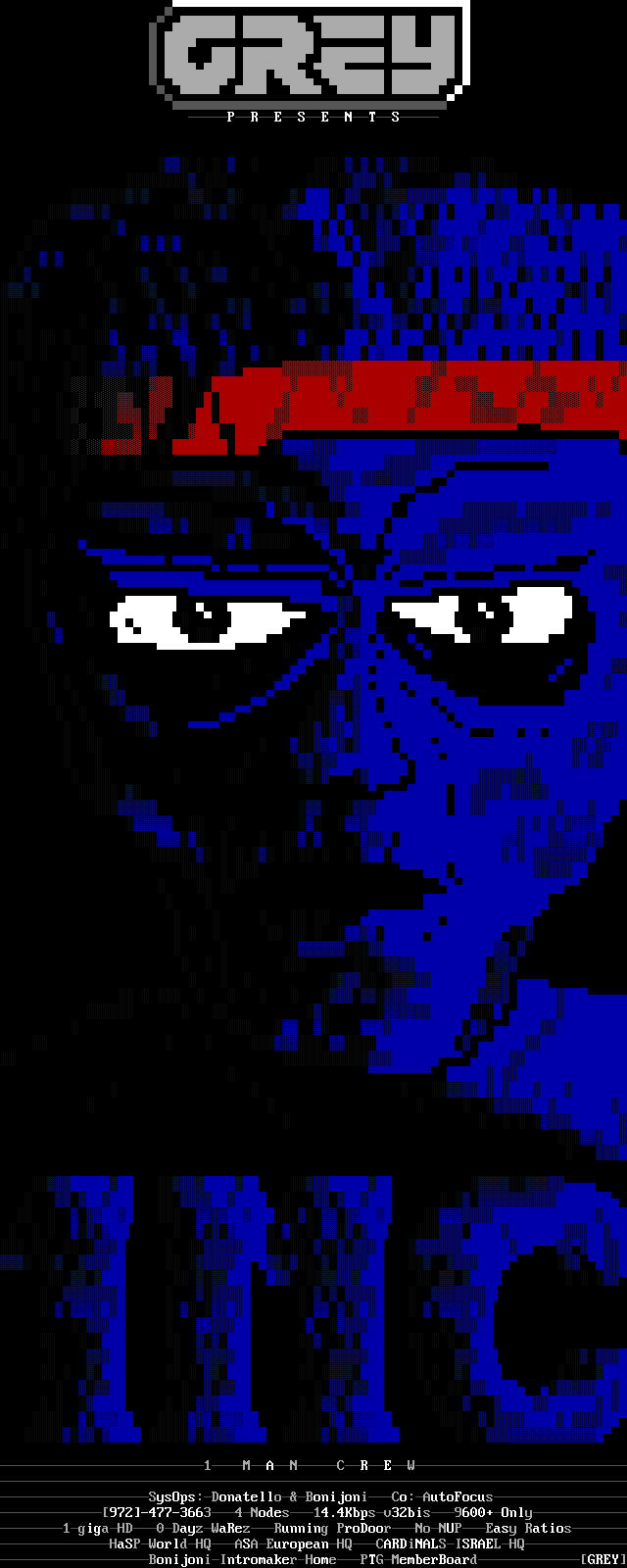 1MANCREWSysOps:DonatelloBonijoniCo:AutoFocus972-477-36634Nodes14.4Kbpsv32bis9600+Only1gigaHD0DayzWaRezRunning ProDoorNoNUPEasy RatiosHaSPWorldHQASAEuropeanHQCARDiNALSISRAELHQBonijoniIntromaker-HomePTGMemberBoardGREY